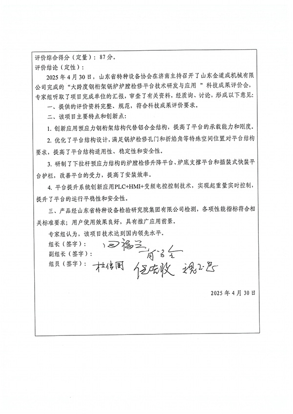 4月30日,山東省特種設備協會組織召開“大跨度鋼桁架鍋爐爐膛檢修平臺技術研發與應用”科技成果評價會,對山東金道成機械有限公司的創新項目進行評估。此次會議匯聚行業頂尖專家,最終認定該技術達到國內領先水平,為鍋爐檢修領域注入新動能。